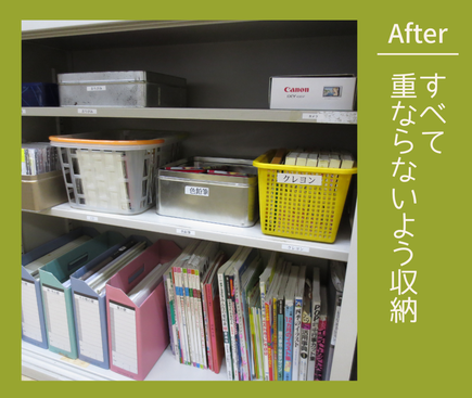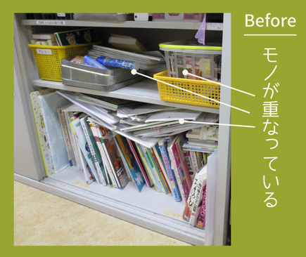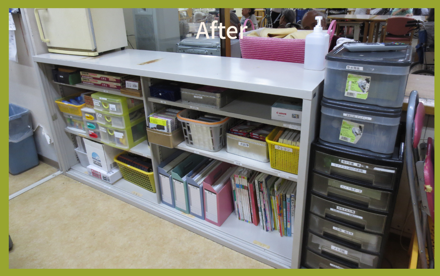 改善:そこで、ラベルなどで中身を表示し見える化します。それにより、どこに何が入っているのか、どこにしまえばいいかが一目瞭然になります。リバウンドしにくくなり、整った状態がキープしやすくなります。