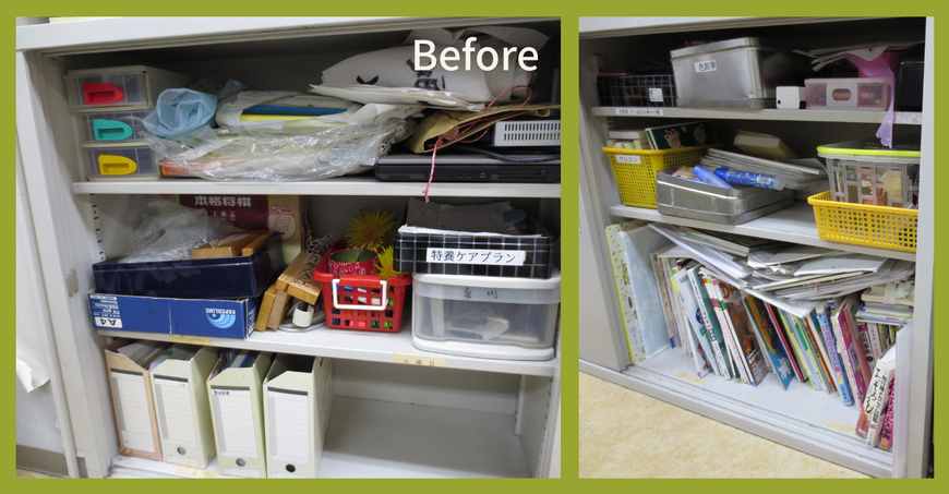 そこで実際の事例を見ながら、職場環境の改善の必要性とその効果について考えてみましょう。見ていただくのは、介護施設に置かれている事務所の棚ひとつ。たったそれだけの小さな範囲にも、驚くほどの改善点が見つかります。